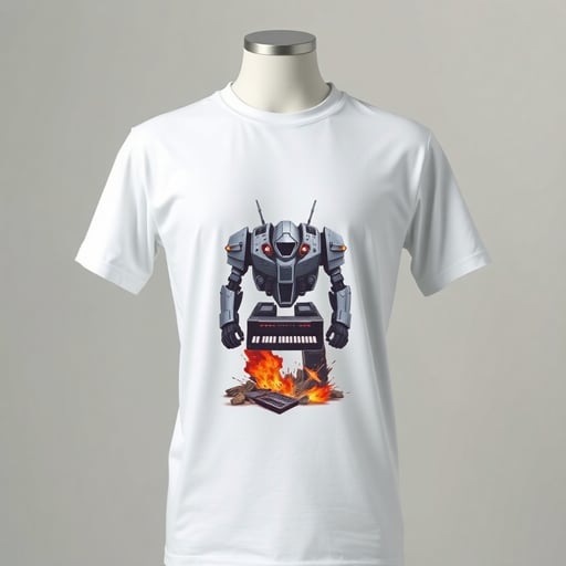 Full body mech robot, in battle, the mech is made of keyboards, speakers, dj related equipment, has X shaped eyes, is surrounded by destruction T-Shirt